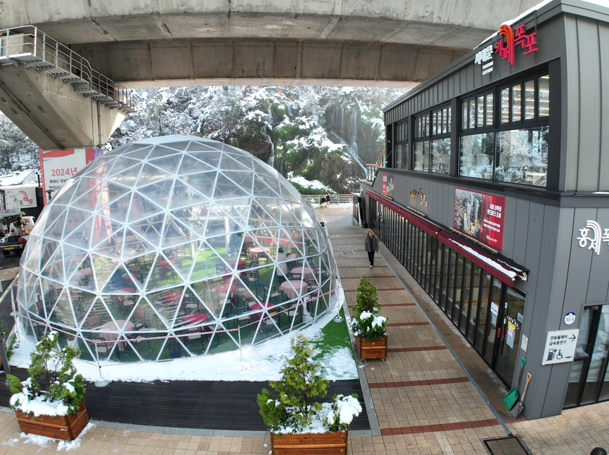 한편 구는 최근 카페폭포 앞에 추위를 막아 주는 대형 돔(사진)을 설치해 겨울철 명소로 많은 인기를 모을 전망이다.